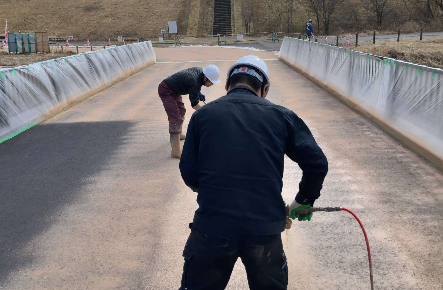 施工中は、各工程の担当者による品質チェックに加え、経験豊富な管理者が定期的に現場を巡回し、温度管理、塗布厚、型押しの精度などを細かく確認。写真記録などを用いたトレーサビリティの確保にも努めています。これにより、万が一の問題発生時にも迅速な原因特定と対応が可能です。