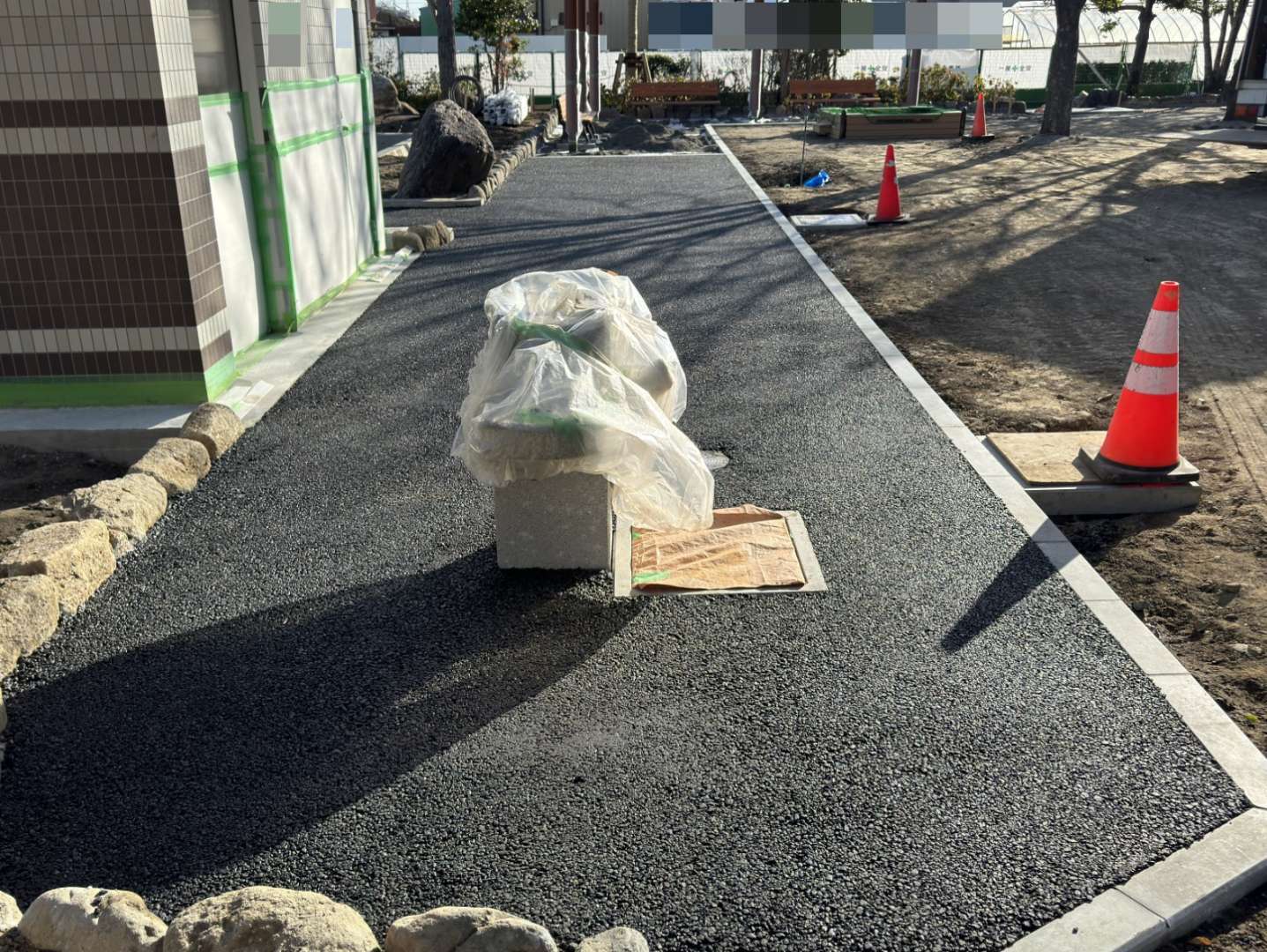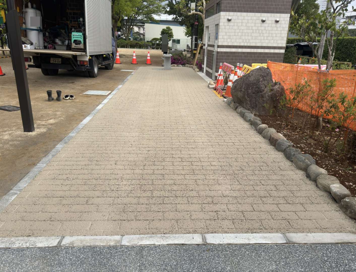 公共道路と住宅地の境界におけるコンクリート打設、柱設置、ブロック積みといった外構工事も数多く手掛けています。これらの経験は、公共施設周辺の整備や、地域と調和する景観設計にも応用されており、安全性と美観を両立させた施工能力を示しています。