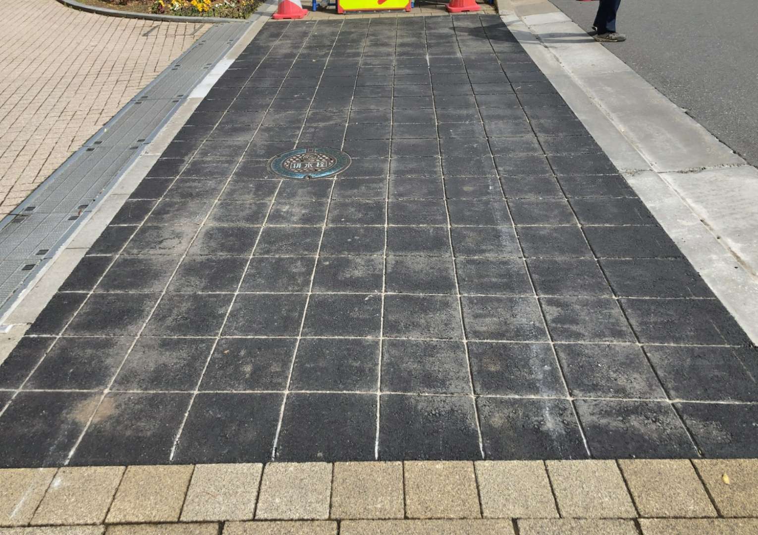 サワケンでは、長年の経験を持つ技術者が、テンプレートの正確な位置決めをミリ単位で調整し、路面全体にわたって均一な圧力で型押しを行います。特に、曲線部や複雑な形状の箇所では、より高度な技術と集中力が求められます。職人の「眼」と「手」が一体となり、一つ一つの模様が鮮明かつ連続的に再現されることで、自然で品格のある公共空間が創造されます。この繊細な作業が、ストリートプリントならではの豊かな表現力を可能にしています。