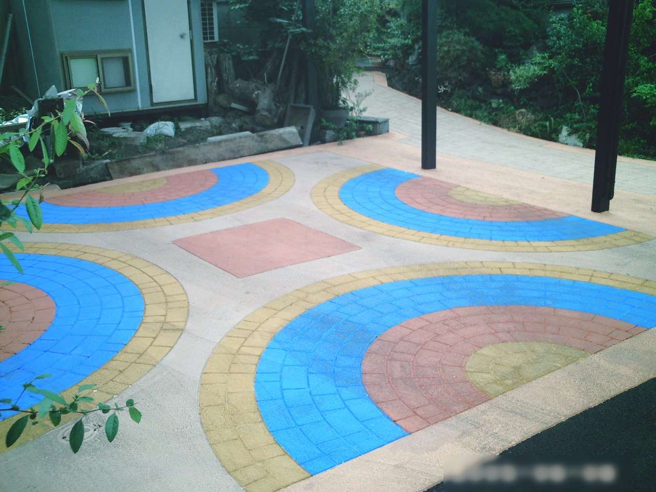 新築戸建て住宅の外構工事において、玄関アプローチおよび駐車場のアスファルトに、ストリートプリント型押し・着色工事を行いました。