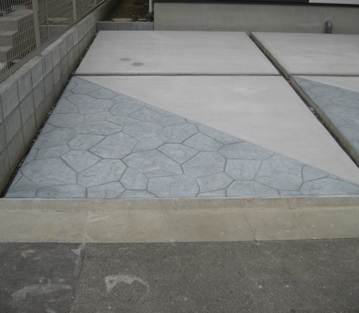 駐車場の部分はコンクリートのみが一般的ですが、変化が少なく見栄えがしないので、スタンプコンクリートを施工しカラフルに仕上げました。