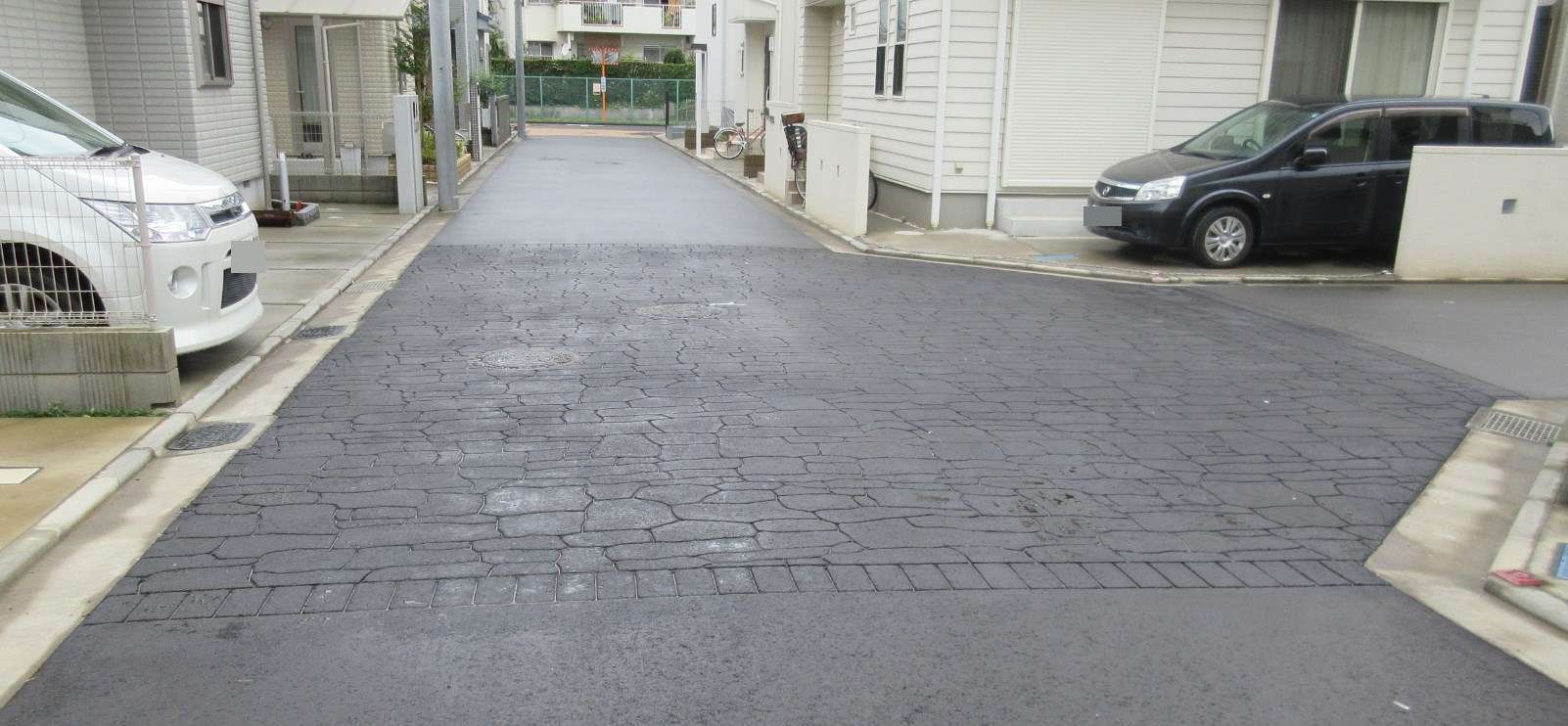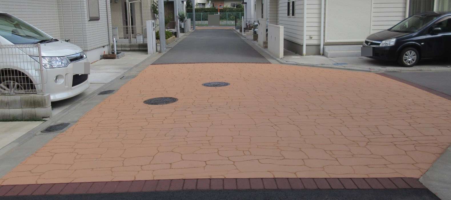 東京都立川市の新築住宅街の引きこみ道路にストリートプリント型押し・着色工事を行いました。