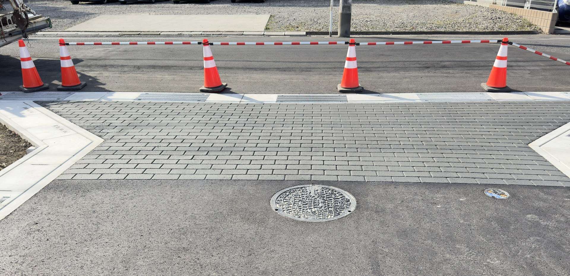 埼玉県春日部市にてストリートプリント工事を行いました。新築戸建て住宅の引き込み道路に施工しました。引き込み道路の出入り口に施工することで、スピードの抑制効果が期待できます。